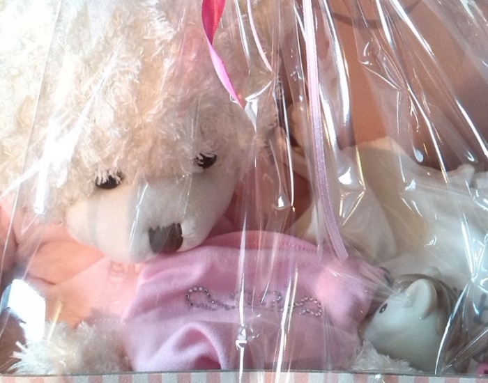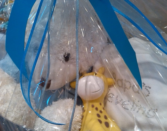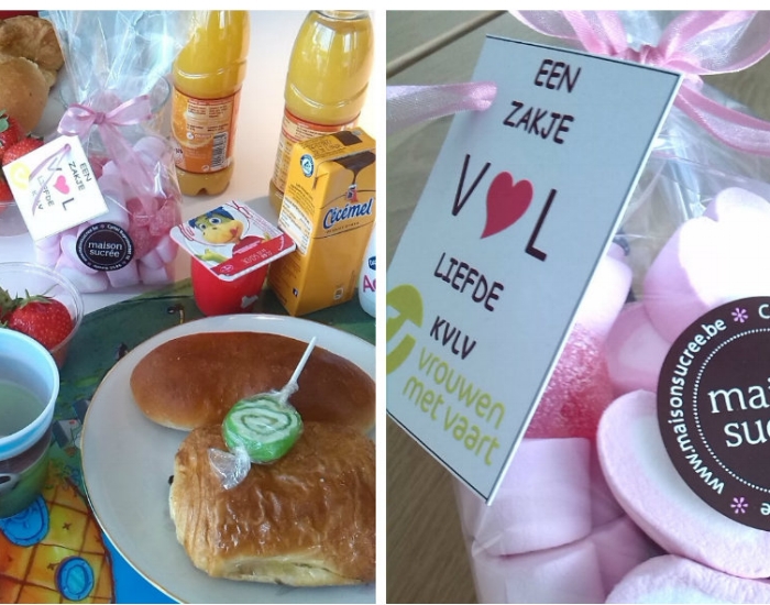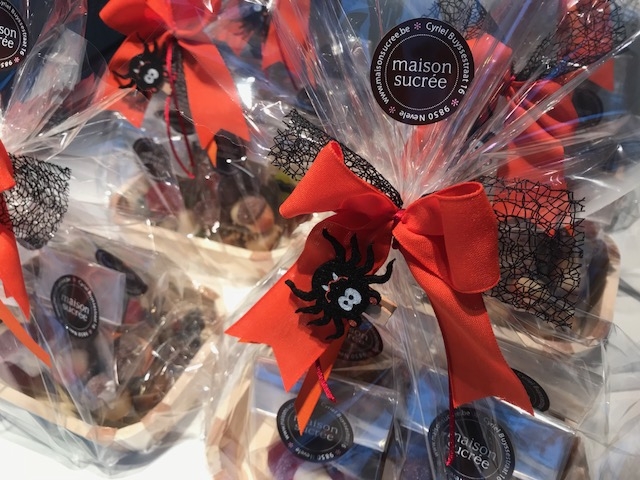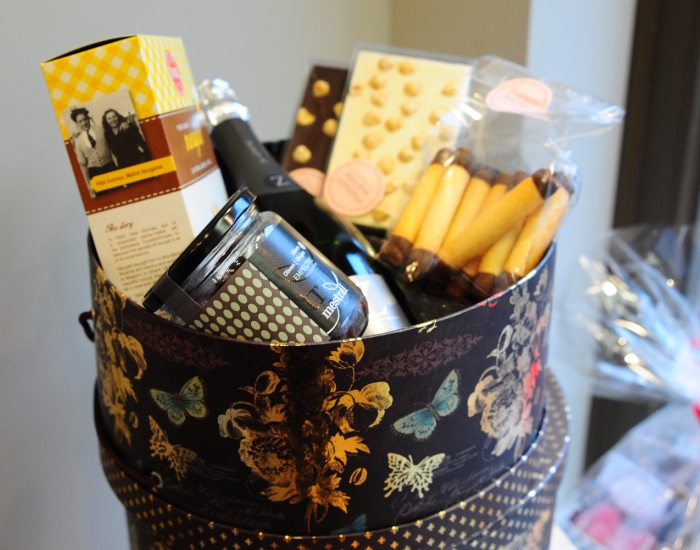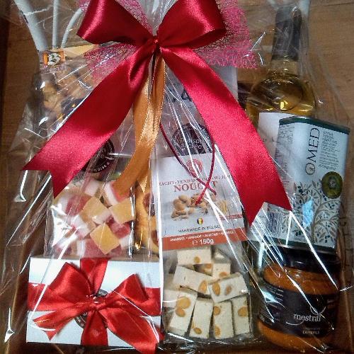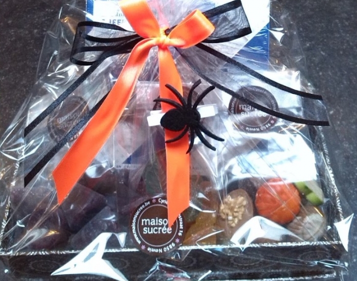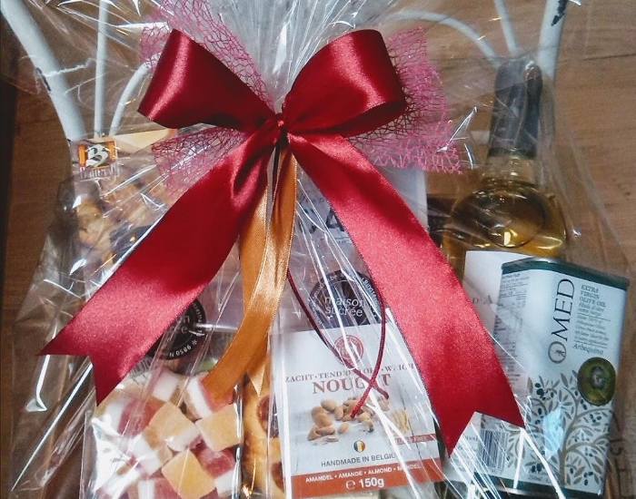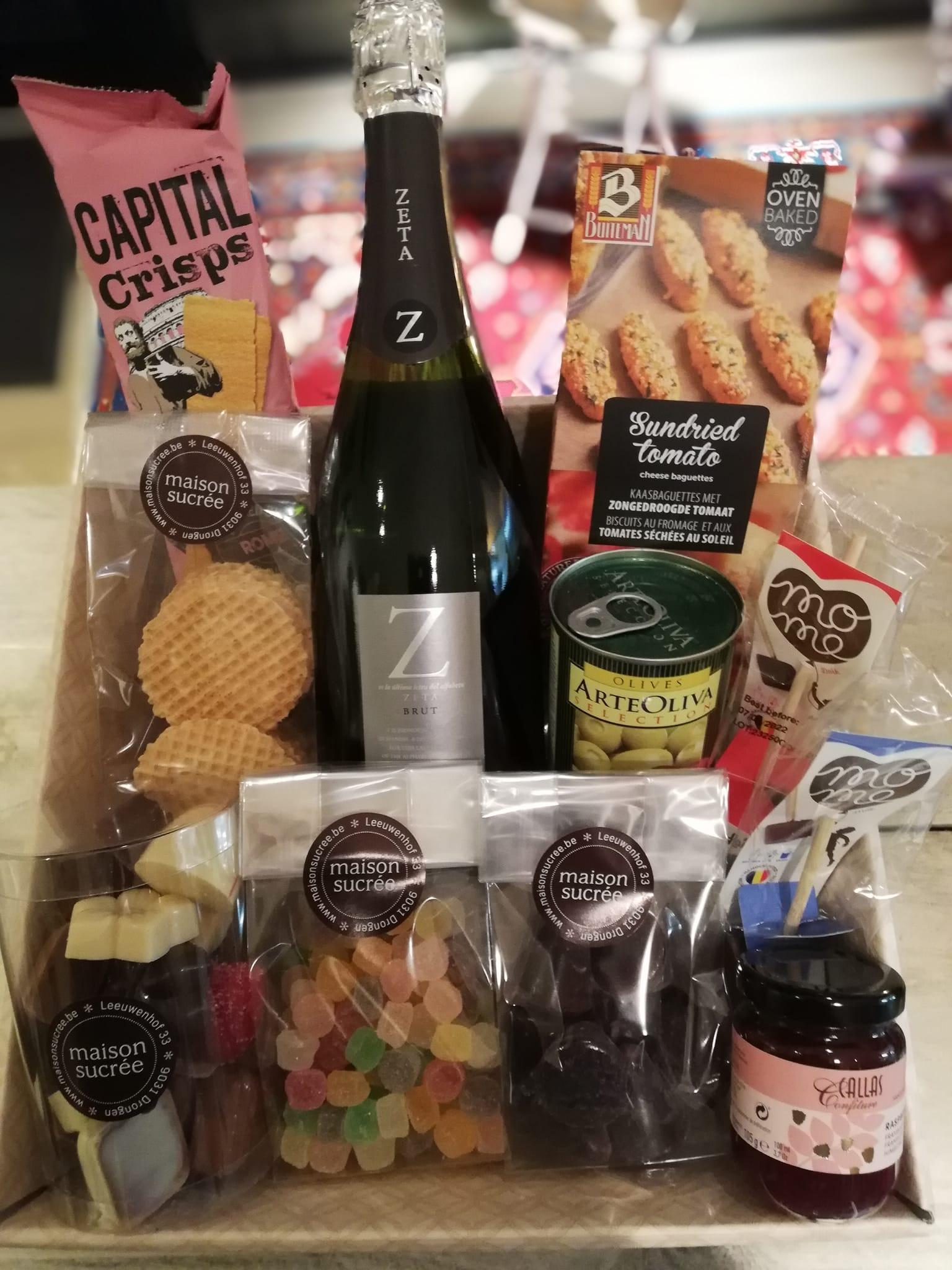 Geschenkmand gevuld met een chocoladezoenen (ambachtelijk melocakes), ambachtelijke koekjes, Antwerps spek (ambachtelijke marshmallows), nougat van Vital, confituur en ambachtelijke pralines : 29,90 €.