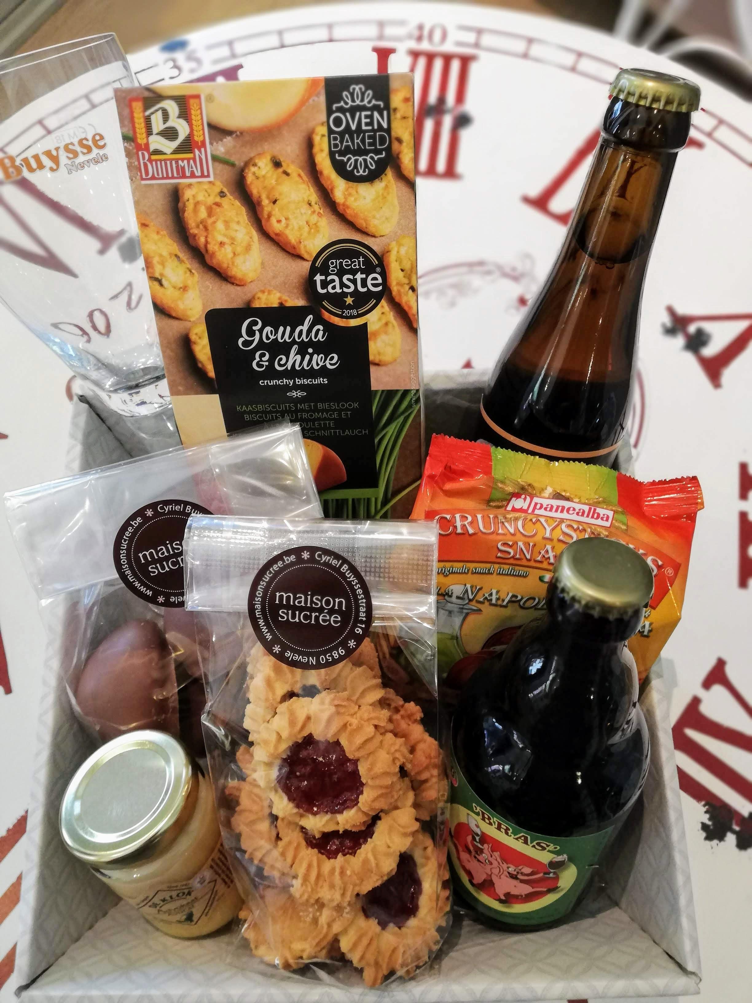 Geschenkmand gevuld met twee soorten lokale biertjes, ambachtelijke koekjes, chocoladezoenen (ambachtelijke melocakes), kaaskoekjes, grissini, advocaat : 31,40 €.