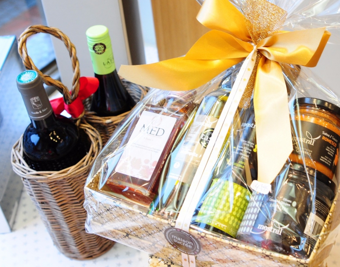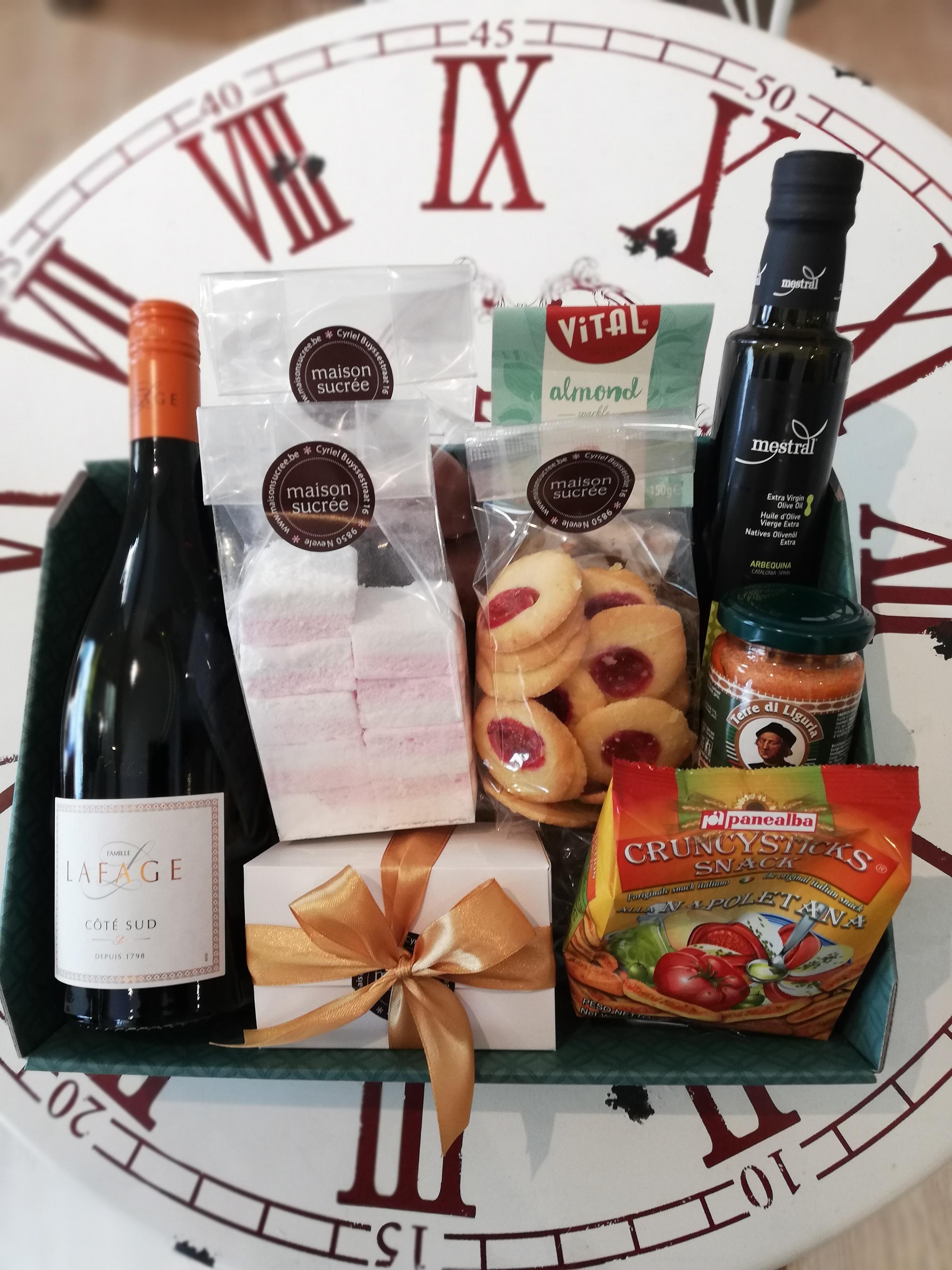 Lafage Côté Sud rode wijn, ambachtelijke koekjes, ambachtelijke marshmallows, Nougat (Vital), pralines van chocolatier Dumon, chocoladezoenen (ambachtelijke melocakes) grissini, Mestral olijfolie, tapenade : 56 €