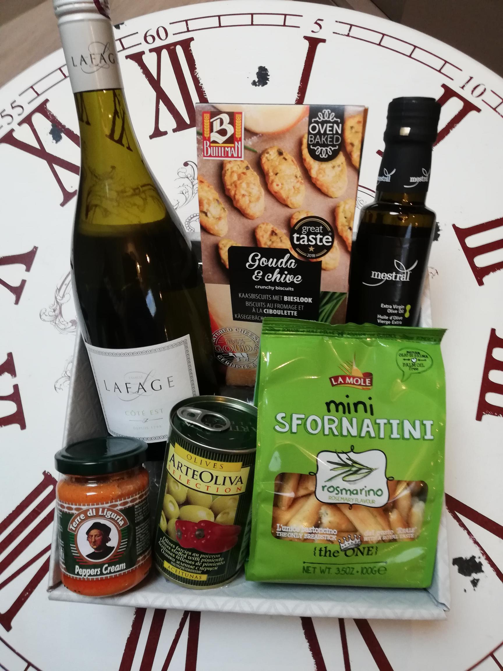 Lafage Côté Sud rode wijn, ambachtelijke koekjes, ambachtelijke marshmallows, Nougat (Vital), pralines van chocolatier Dumon, chocoladezoenen (ambachtelijke melocakes) grissini, Mestral olijfolie, tapenade : 56 €